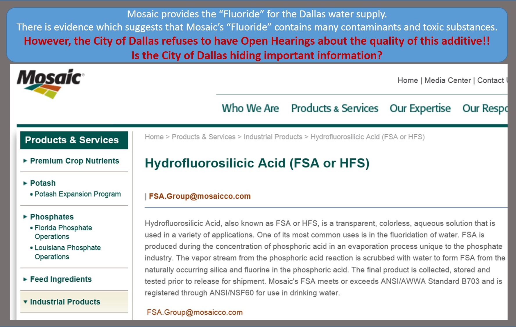 DALLAS FOR SAFER WATER, originally known as DOGS AGAINST FLUORIDATION, is an effort to get the City of Dallas to stop needlessly adding toxic Fluoride chemical poisons to the public water supply (which include Arsenic, Lead, Mercury, radioactive particulates, Cadmium, P2O5, etc.) The EPA classifies the Fluoride chemical mix (HFS) as corrosive, hazardous, toxic waste. It is illegal to dump it in normal landfills or waterways. Yet, City Council members put it in our drinking water.