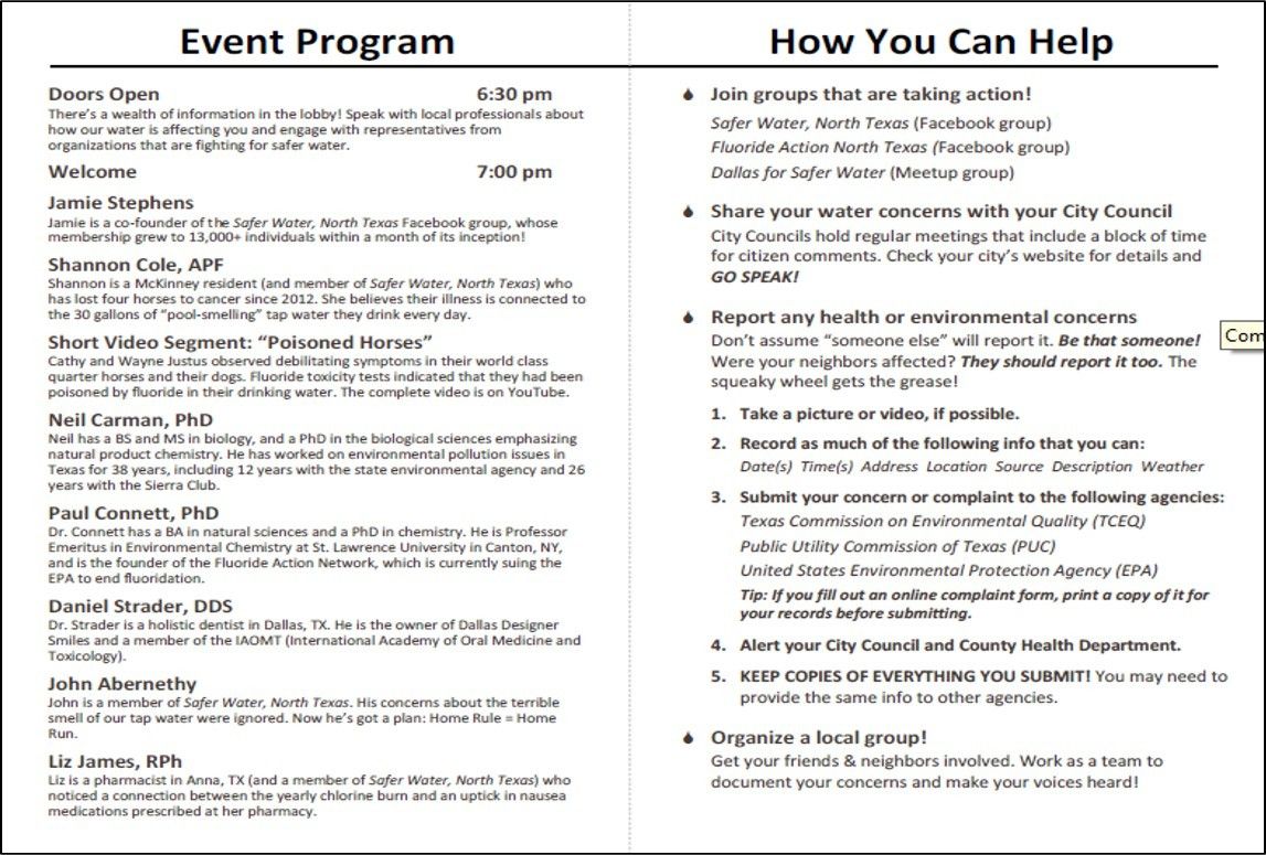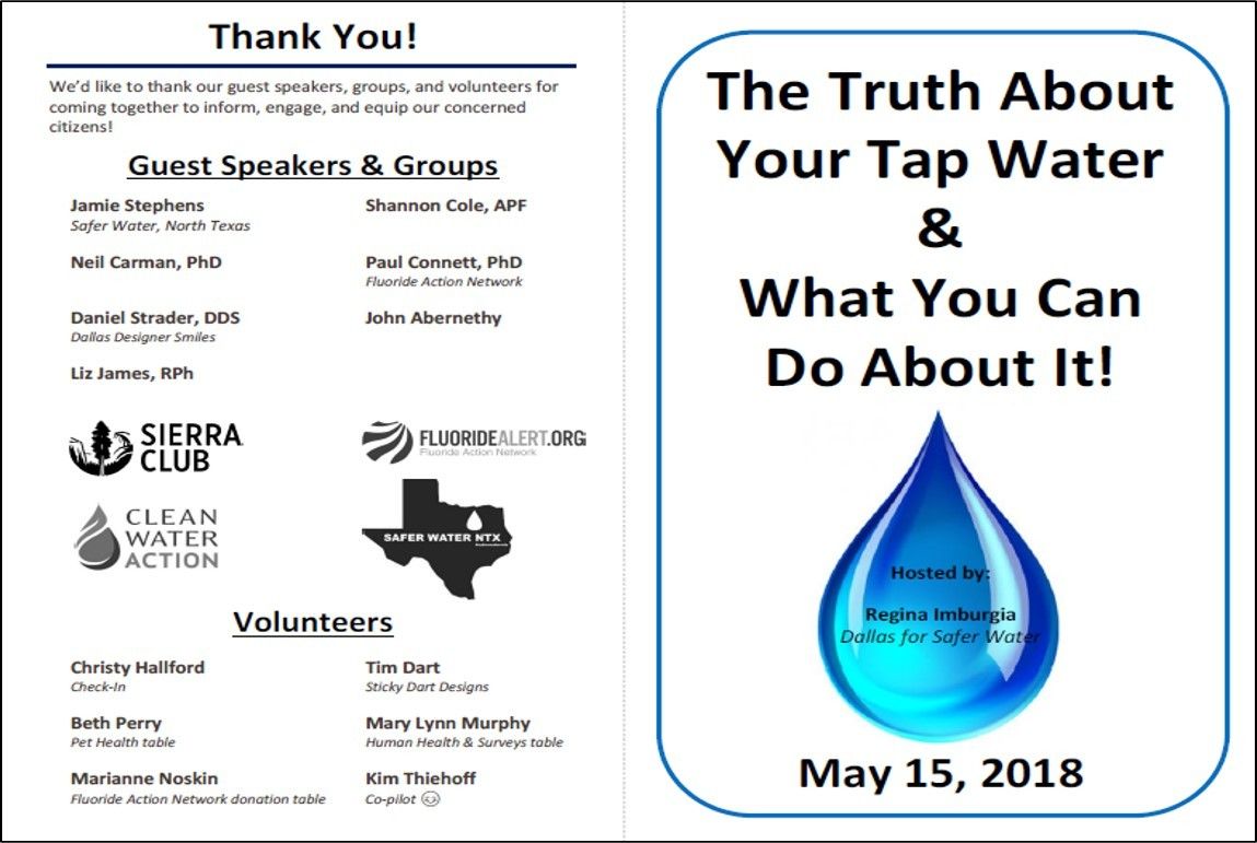 the May 15th event, “Tap Water – How Can It Be Safer?” for Dallas and its suburbs.