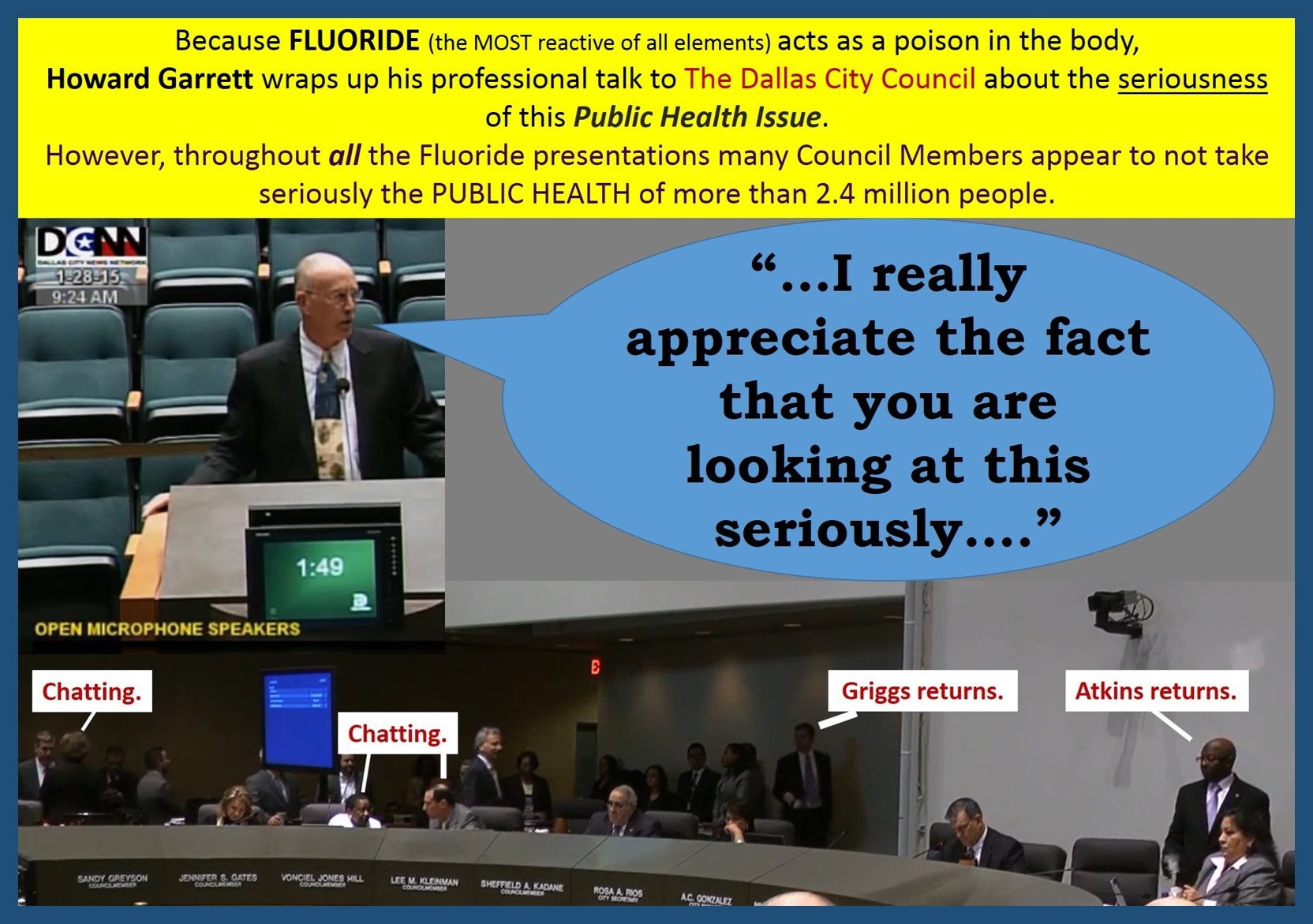 Dr. David Kennedy, an esteemed 3rd generation Dentist of more than 20 years, who also has been on the Board of Directors of several dental organizations and is past President of “International Academy of Oral Medicine and Toxicology”, goes over in great detail Item # 44 of the Dallas City Council vote on January 28th (Fluoridation of Public Water).