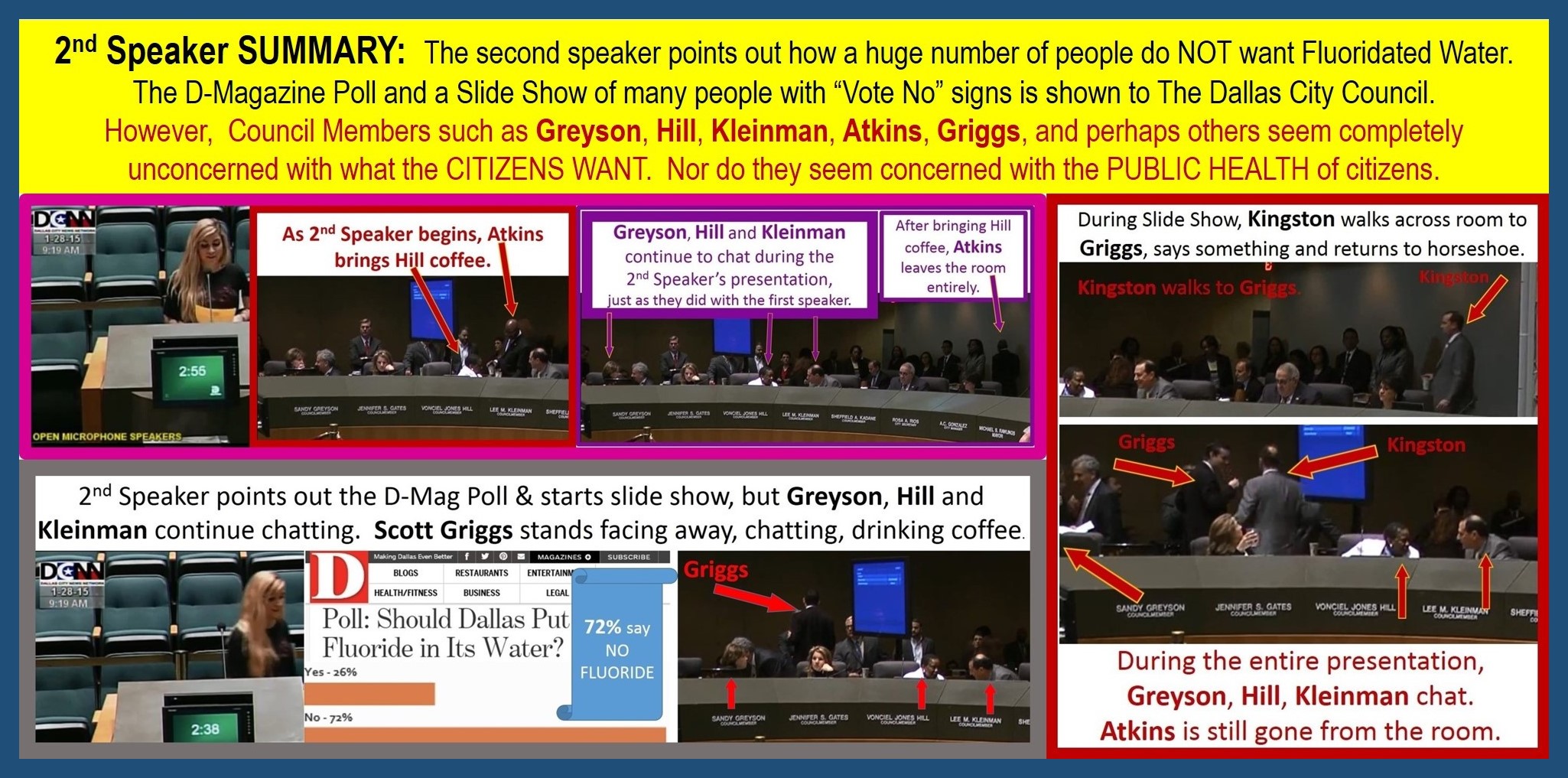 Regina Imburgia speaks to the Dallas City Council telling them about what is happening in Plano. She chides the Dallas City Council for not having open communication about the water fluoridation issue. Regina brings up the D-Magazine poll which showed the majority of citizens want fluoridation stopped. The City Council has NEVER provided one scientific study which demonstrates that swallowing fluoride is safe for everyone. However, the City Council repeatedly has been provided with reams of scientific literature which shows the harmful health effects of swallowing fluoride. The City refuses to use the "Precautionary Principle" in order to protect the health of all citizens. Regina points out how the EPA Lawsuit regarding fluoridation is moving forward with the Judge ruling in our favor (on the side of science) on several occasions. "It is time for you guys to have an open meeting! ...What are you afraid of?"