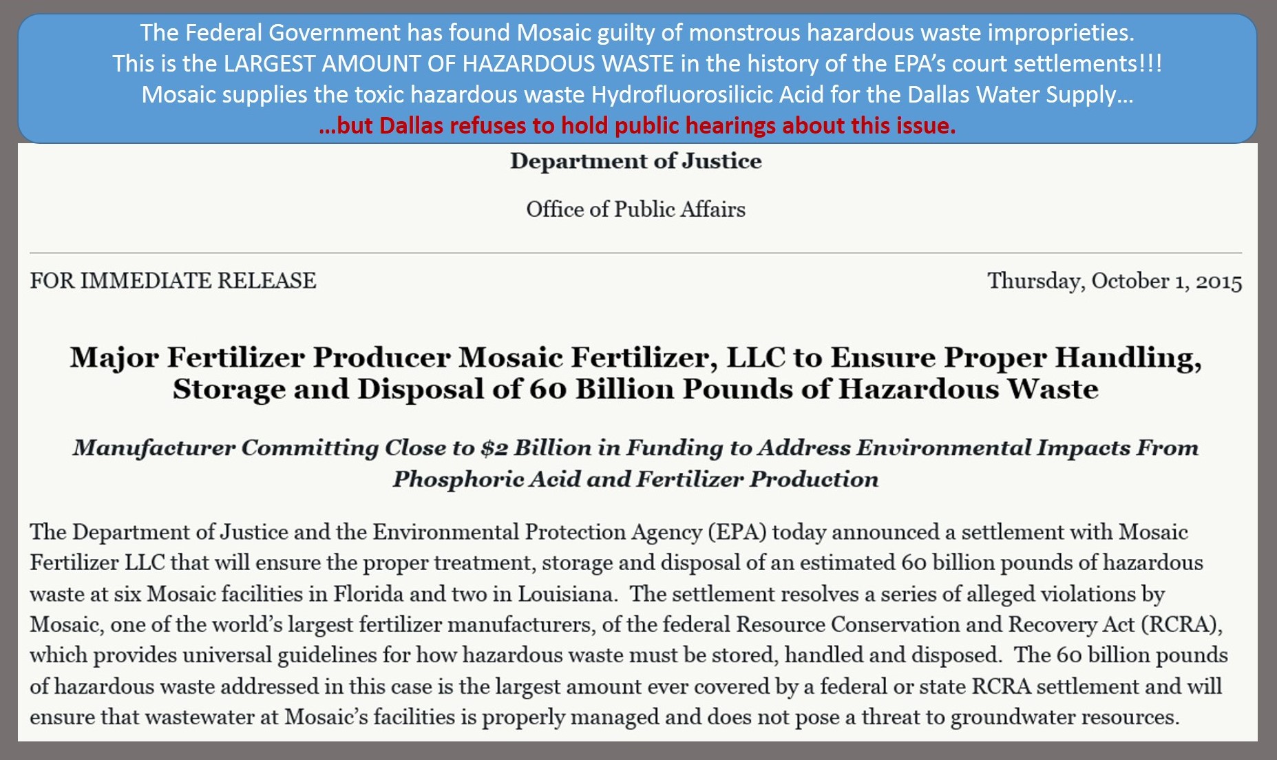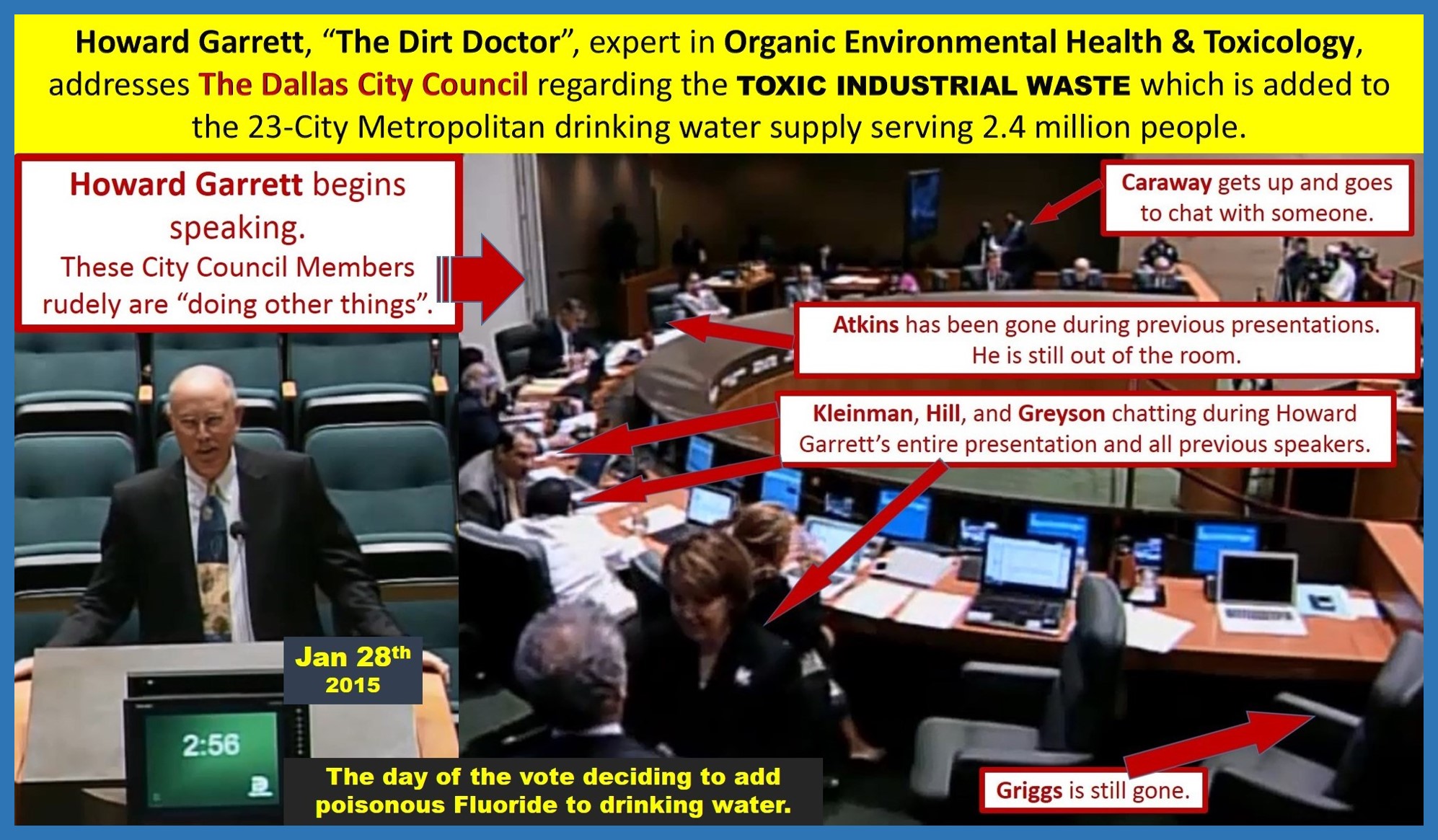 Go to THIS PAGE to see all the media links and news (Dog-Fight in the News Media) surrounding the VOTE on Fluoride for Dallas. The VOTE occurred on January 28th, 2015. Two Council Members wisely recognized the liabilities involved with adding a toxic hazardous waste substance which does not conform to Texas Law.