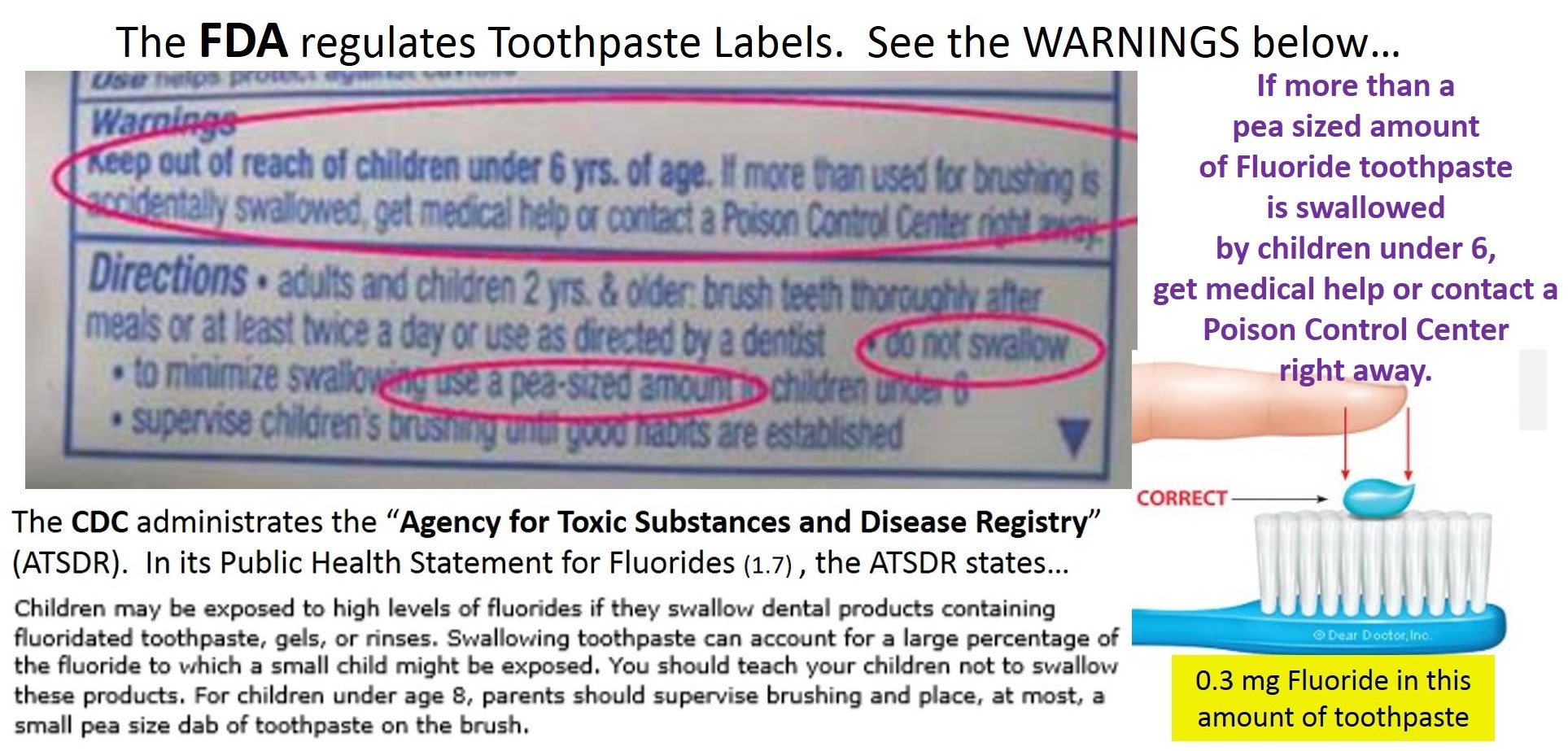 If more than a pea sized amount of Fluoride toothpaste is swallowed by children under 6 (or DOGS), get medical help or contact a Poison Control Center right away.
